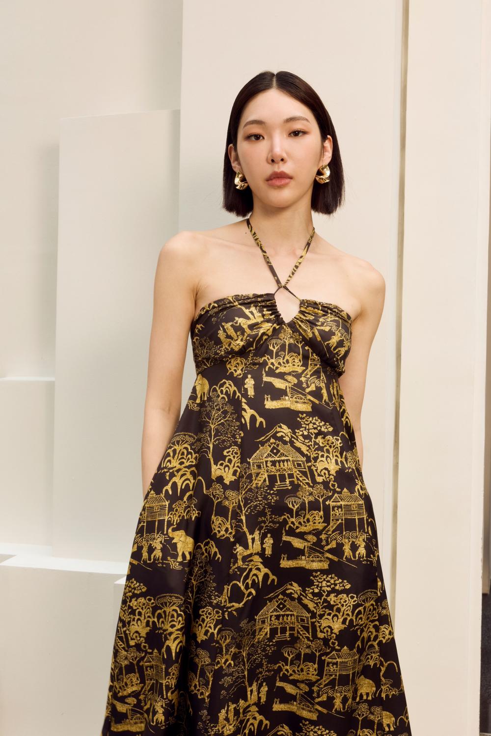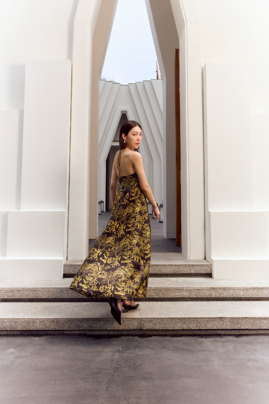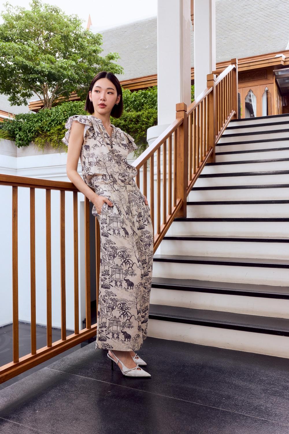 Woodland Voyage หนึ่งในลายพิมพ์ไฮไลต์ที่สะท้อนมรดกไทยผ่านมุมมองร่วมสมัย ตีความบรรยากาศแห่งการเฉลิมฉลองของเทศกาลสงกรานต์ผ่านภาพจิตรกรรมฝาผนังจากวัดเก่าในภาคอีสานที่บอกเล่าเรื่องราวของนิทานพื้นบ้านเรื่อง สินไซโดยนำศิลปะพื้นถิ่นอันทรงคุณค่ามาผสมผสานกับสไตล์โมเดิร์น มอบลุคที่ดูสง่างามและแฝงด้วยความสนุกสนานอย่างลงตัว