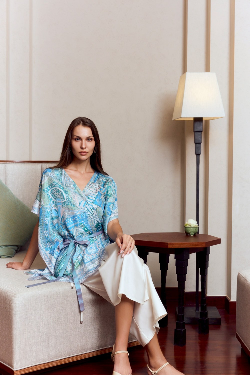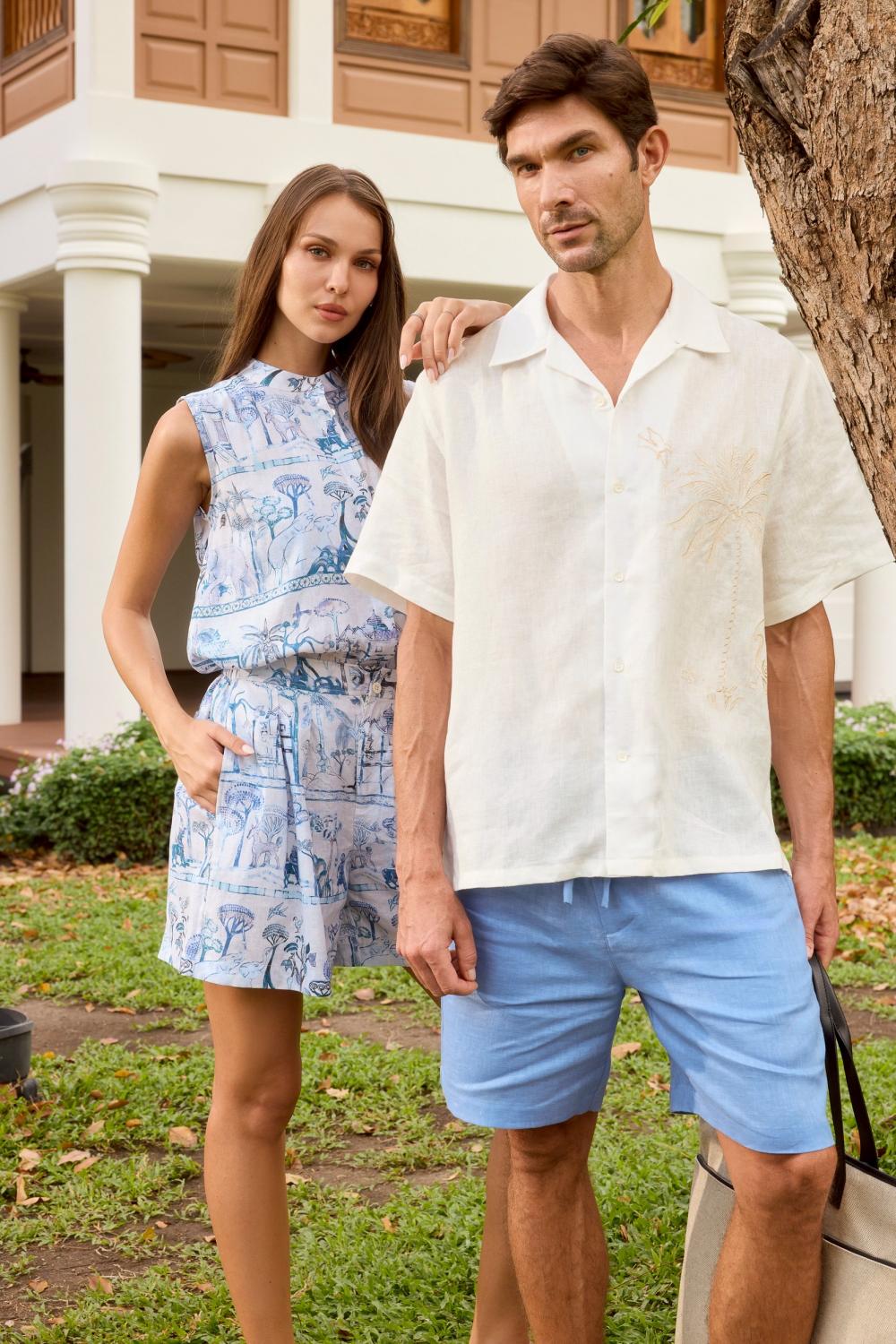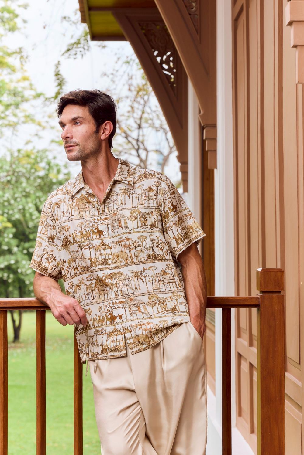 Woodland Voyage หนึ่งในลายพิมพ์ไฮไลต์ที่สะท้อนมรดกไทยผ่านมุมมองร่วมสมัย ตีความบรรยากาศแห่งการเฉลิมฉลองของเทศกาลสงกรานต์ผ่านภาพจิตรกรรมฝาผนังจากวัดเก่าในภาคอีสานที่บอกเล่าเรื่องราวของนิทานพื้นบ้านเรื่อง สินไซโดยนำศิลปะพื้นถิ่นอันทรงคุณค่ามาผสมผสานกับสไตล์โมเดิร์น มอบลุคที่ดูสง่างามและแฝงด้วยความสนุกสนานอย่างลงตัว