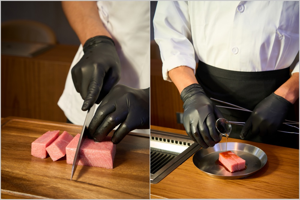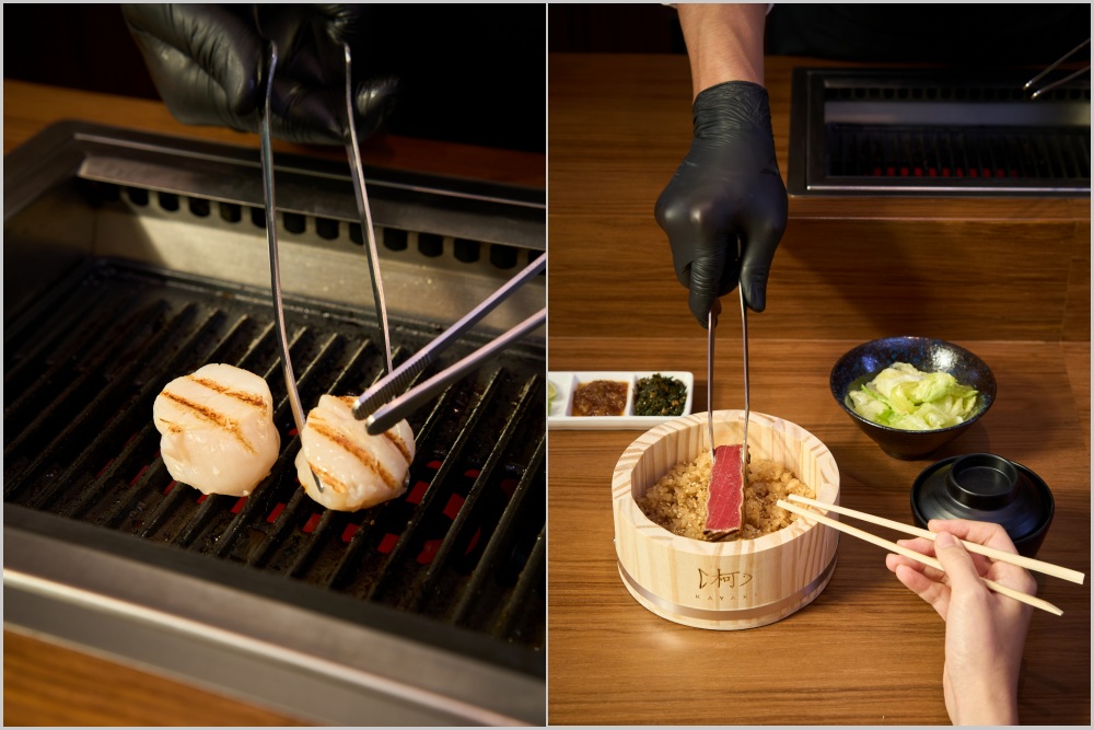 อย่างที่ทราบกันดีว่าคนญี่ปุ่นจะมีวัฒนธรรมและพิธีการในการรับประทานอาหารในแบบฉบับของคนญี่ปุ่น เราจึงมีการเทรนด์พนักงานให้มาย่างเนื้อปลาโดยเฉพาะ พร้อมเสิร์ฟให้ทานทีละคำ เนื่องจากปลาแต่ละชนิดจะรับประทานด้วยความสุกที่แตกต่างกันไป รวมถึงต้องคุมอุณหภูมิและเวลาให้เหมาะพอดี ทานคู่กับข้าวญี่ปุ่นปรุงพิเศษจากทางร้าน เสิร์ฟมาพร้อมกับเครื่องปรุงและน้ำซอสเอาไว้จิ้มทานคู่กัน ปลาทุกชิ้นจะเสิร์ฟมาแบบมีเดียมแรร์คือ เนื้อสัมผัสภายนอกจะมีความสุกนิดๆ หอมกลิ่นสโมคเบา ๆ บนผิวของเนื้อปลา แต่ยังได้ความปลาดิบข้างใน ซึ่งคงรสชาติความหวานของเนื้อปลาอยู่เป็นเนื้อสัมผัสที่แปลกใหม่