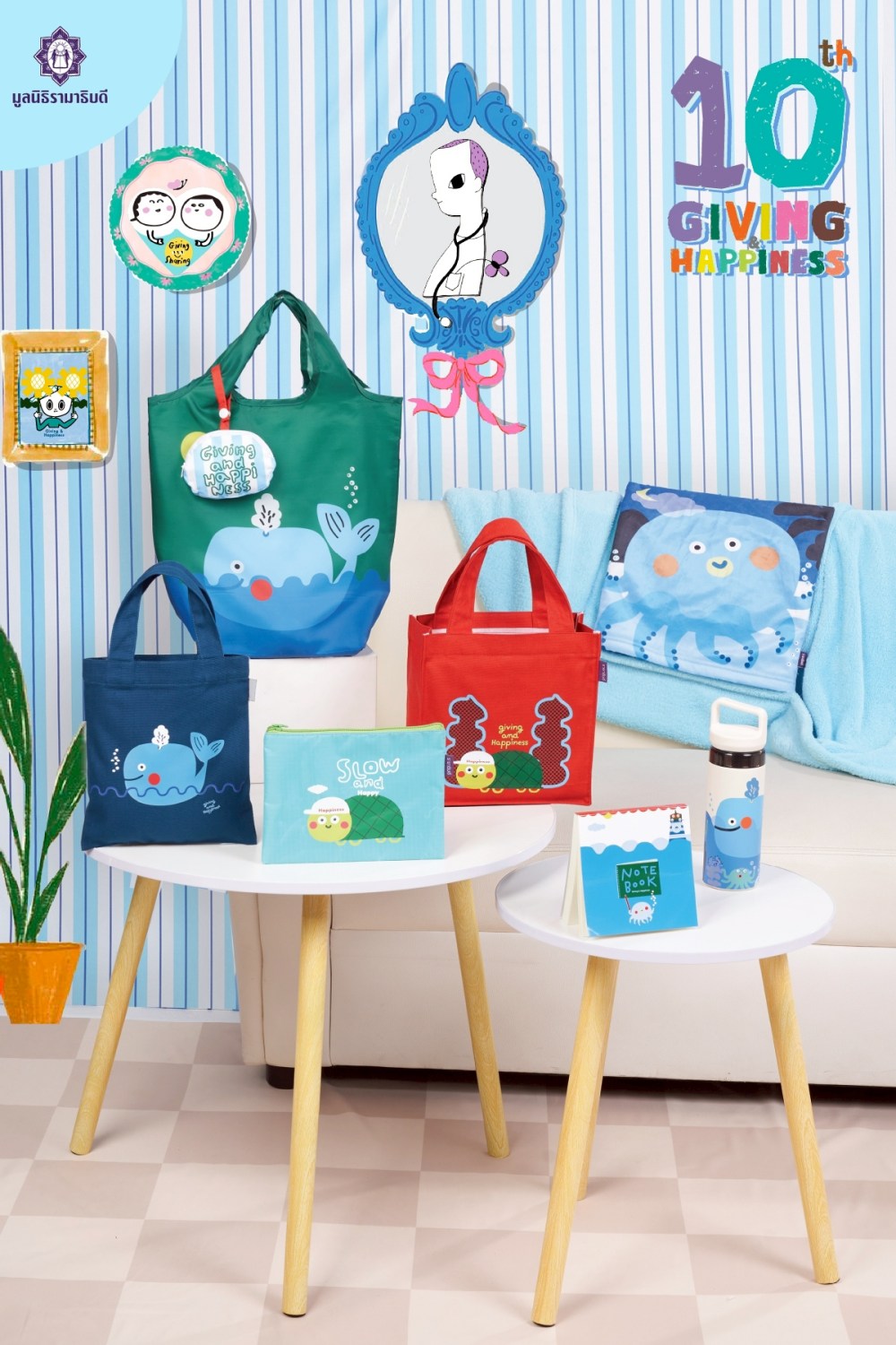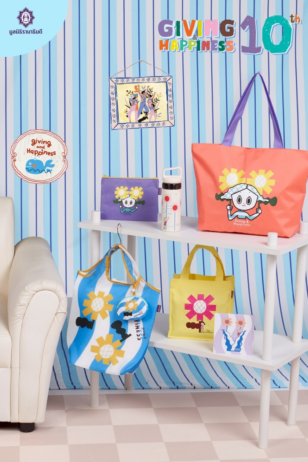 สำหรับของที่ระลึกการกุศลคอลเลกชัน Giving and Happiness ปีที่ 10 ถูกนำมาสร้างสรรค์เป็นของที่ระลึกการกุศลหลากหลายรายการที่ตอบโจทย์ทุกไลฟ์สไตล์ ให้ได้เลือกสรรเพื่อเป็นของขวัญให้ตัวเองและคนที่รัก อาทิ เสื้อยืดทีเชิ้ต สำหรับผู้ใหญ่ ราคา 199 บาท และเด็ก ราคา 169 บาท, หมวกแก๊ป ราคา 250 บาท, กระเป๋าสะพายผ้าลิปสต็อป ราคา 120 บาท, กระเป๋าดินสอ ราคา 59 บาท, กระเป๋าโท้ทผ้าไมโคร ราคา 69 บาท, กระเป๋าผ้าแคนวาสอเนกประสงค์ ราคา 179 บาท, กระเป๋าถือแคนวาสใบเล็ก ราคา 99 บาท, กระเป๋าพับเก็บห้อยพกพา ราคา 129 บาท, กระบอกน้ำเก็บอุณหภูมิ ราคา 399 บาท, หมอนผ้าห่ม ราคา 399 บาท, ร่มพับ 2 ตอน ราคา 250 บาท, ปลอกหมอนบทสวดมนต์ ราคา 180 บาท และสมุดฉีก ราคา 49 บาท