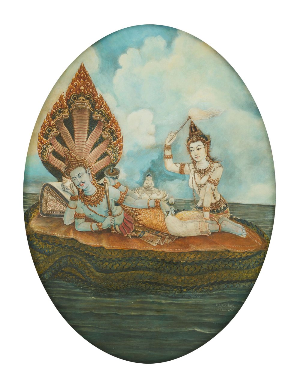 ผลงานจิตรกรรมของพระเทวาภินิมมิต (ฉายเทียมศิลปไชย) หนึ่งในช่างศิลป์คนสำคัญที่ได้ถวายงานแก่ราชสำนักตั้งแต่รัชสมัยพระบาทสมเด็จพระจุลจอมเกล้าเจ้าอยู่หัว รัชกาลที่ 5 ทั้งยังเป็นพระอาจารย์ทางด้านศิลปะของในหลวงรัชกาลที่ 8 และรัชกาลที่ 9 ภาพนารายณ์บรรทมสินธุ์สร้างขึ้นใน พ.ศ. 2477 เป็นภาพพระนารายณ์ขณะบรรทมมีพระพรหมผุดขึ้นมากลางพระนาภี (สะดือ)