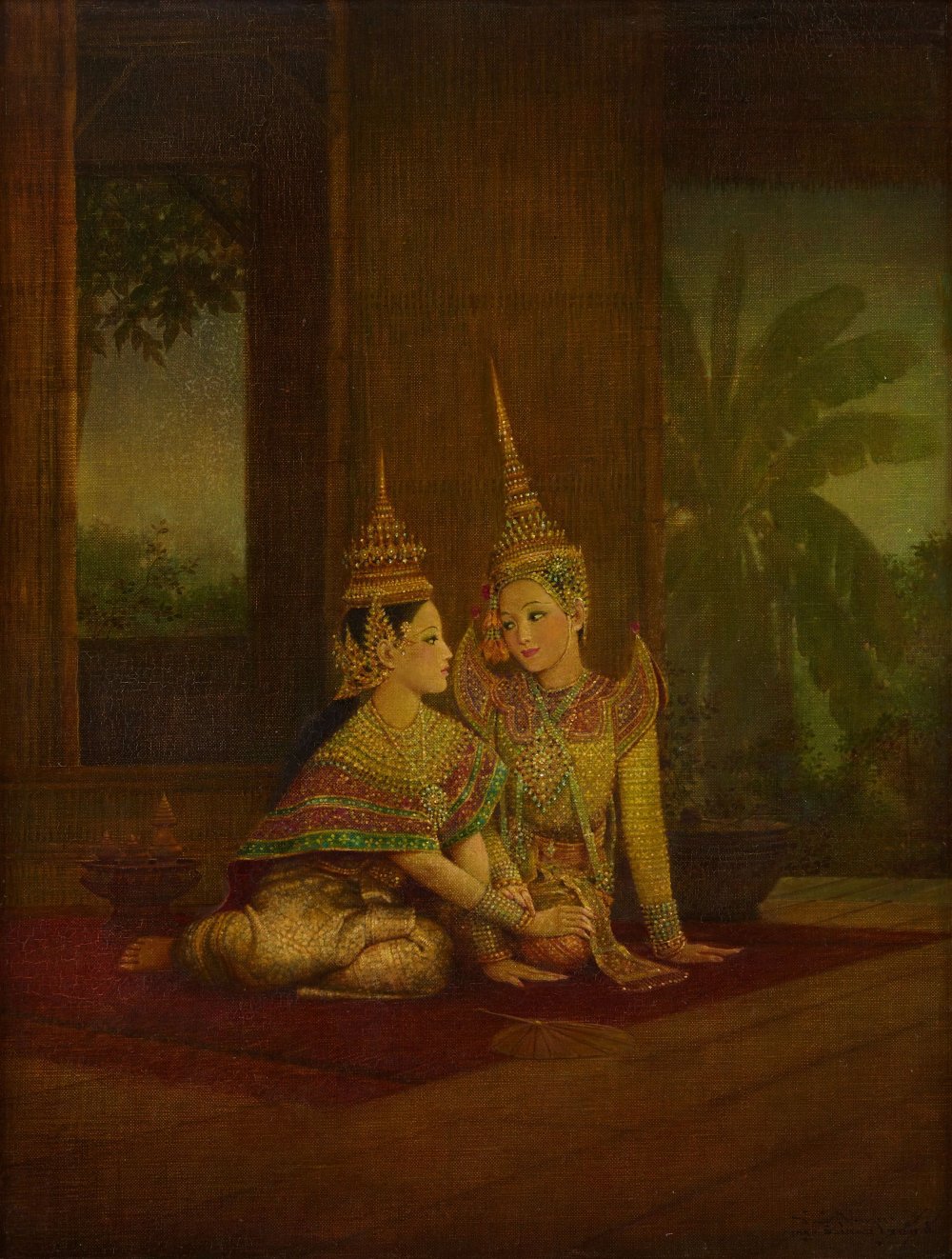 จิตรกรรมของ จักรพันธุ์ โปษยกฤต ชิ้นนี้สร้างขึ้นในปี พ.ศ.2525 ด้วยเทคนิคสีน้ำมันบนผืนผ้าใบ เป็นภาพตัวละครที่แต่งองค์ทรงเครื่องสวมบทบาทพระสังข์ทองและนางรจนา ฉากหลังเป็นกระท่อมกลางป่า โครงสีของภาพอบอุ่นด้วยบรรยากาศของแสง เครื่องแต่งกายสอดคล้องตามแบบแผนของตัวละครผสมผสานกับรายละเอียดวิจิตรตามจินตนาการส่วนตัวของศิลปิน